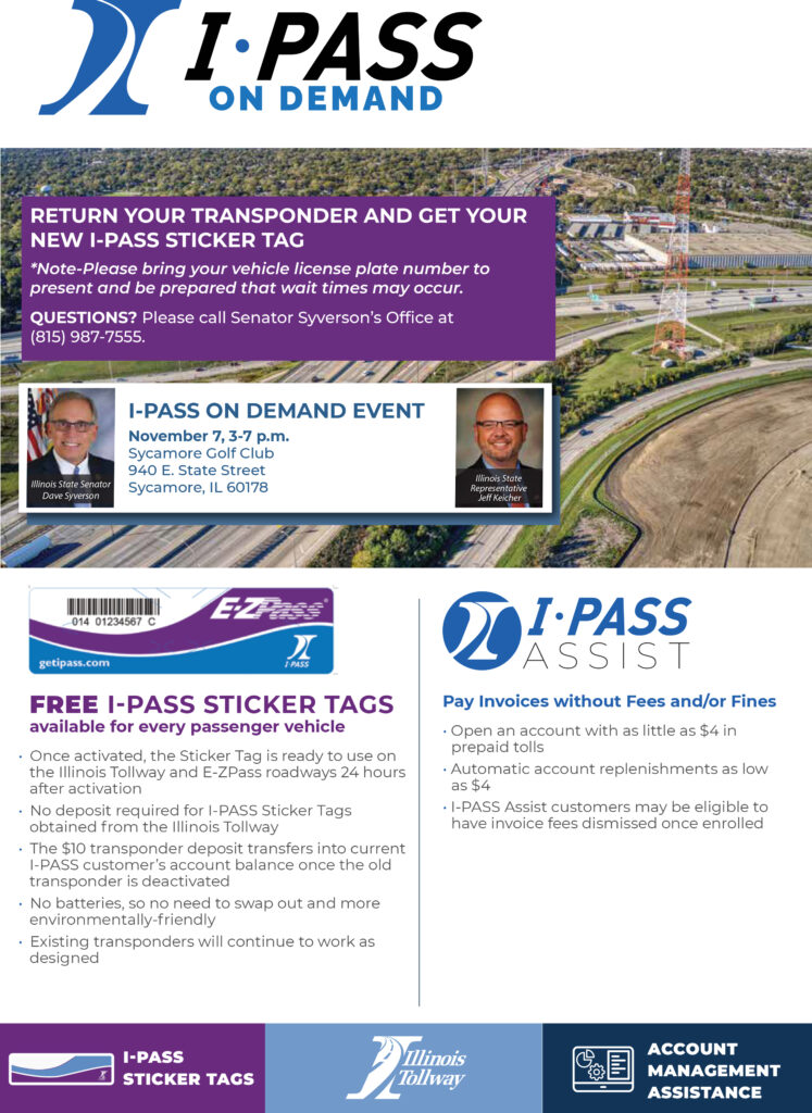 SYCAMORE – State Sen. Dave Syverson (R-Cherry Valley) and State Rep. Jeff Keicher (R-Sycamore) are partnering with the Illinois Tollway Nov. 7 in Sycamore to help motorists update their I-PASS technology to the Sticker Tags that are replacing plastic transponders. An I-PASS ON DEMAND event is scheduled from 3:00 p.m. to 7:00 p.m., Nov. 7, at […]