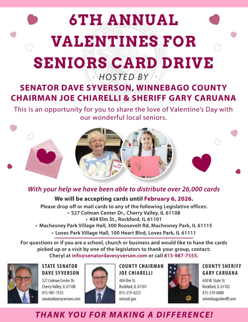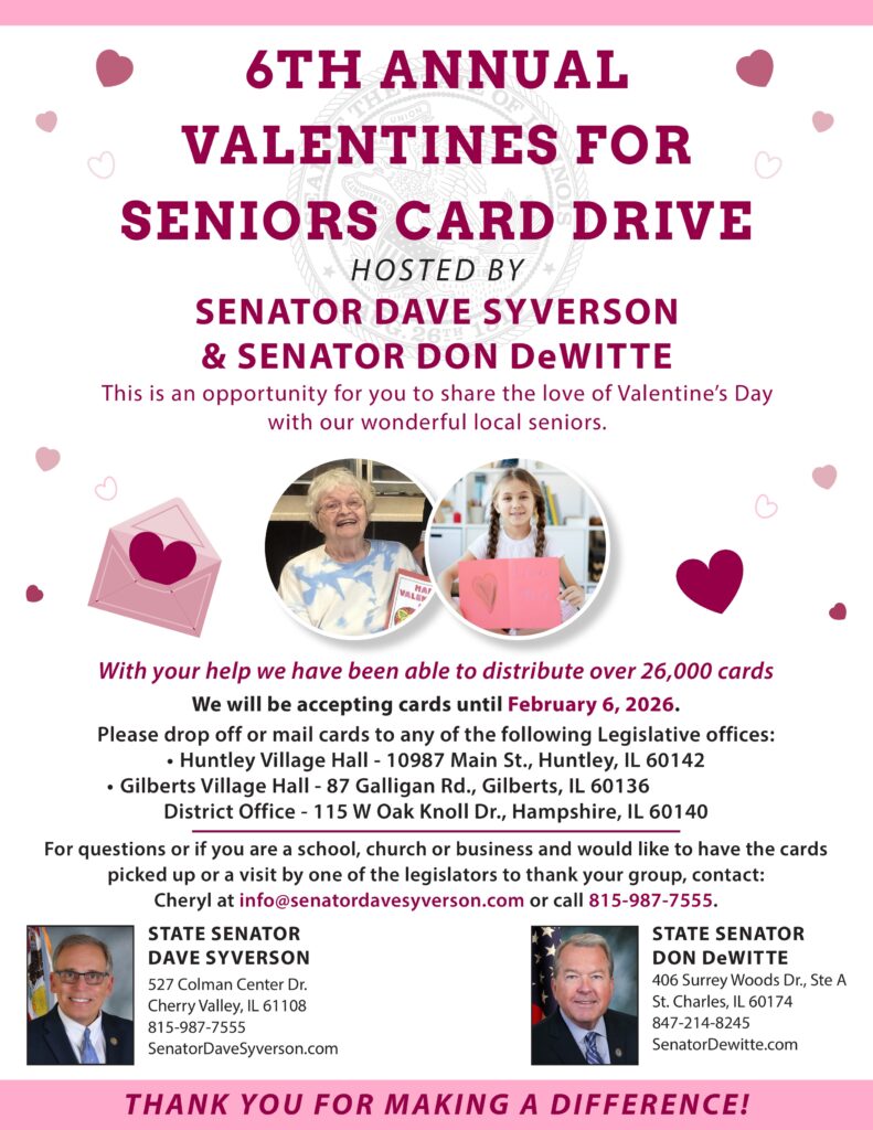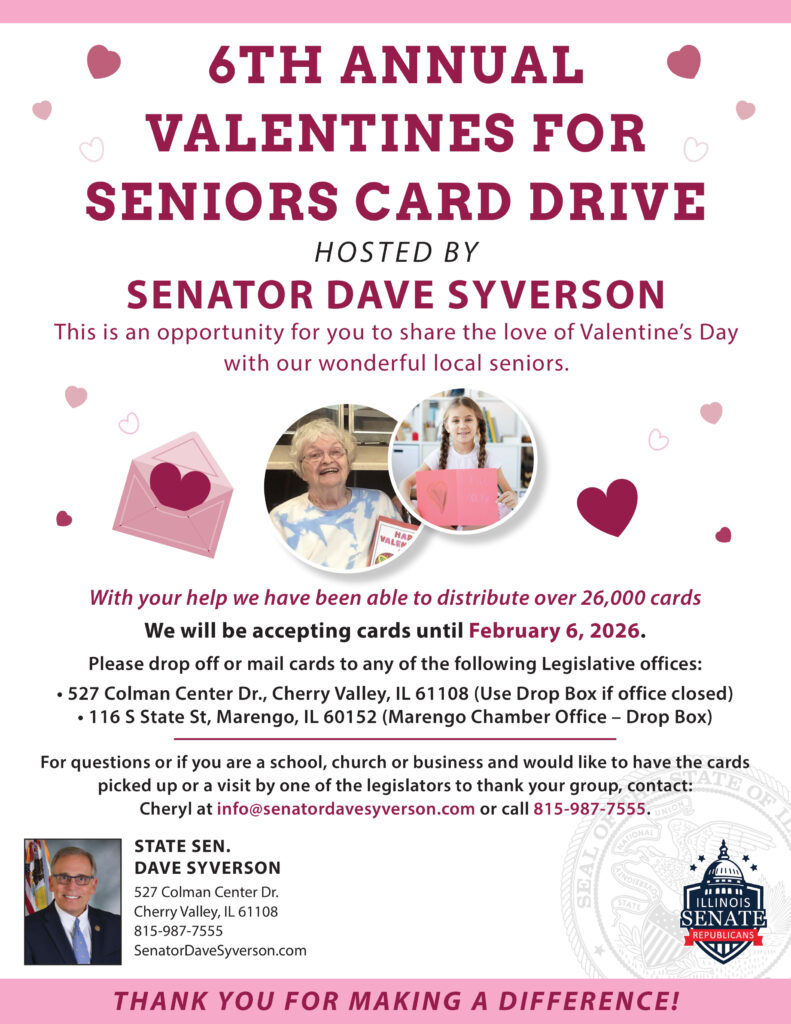 Senator Syverson is encouraging community members, churches, schools, and other groups to participate by dropping off or mailing Valentine’s Day cards to drop-off locations throughout the district. Once the cards have been collected, they will be delivered by the lawmakers and their district staffers on the communities’ behalf to residents of assisted living and long-term care facilities in communities across the region.