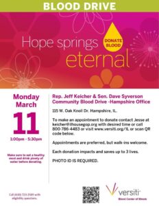 HAMPSHIRE – State Senator Dave Syverson (R-Cherry Valley) and State Representative Jeff Keicher (R-Sycamore) are working with Versiti Blood Center of Illinois to host a