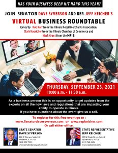 Please join State Senator Syverson and State Representative Jeff Keicher in a Virtual Business Roundtable joined by Rob Karr from the Illinois Retail Merchants Association,